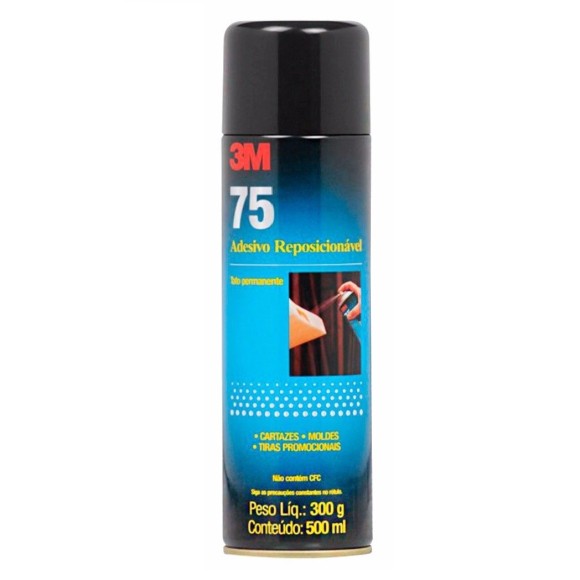 O Adesivo Spray 75 é um adesivo em aerossol ideal para utilizações que necessitam de uma adesão temporária, como máscaras de papel, pinturas, tecidos nas operações de silk screen e fixações para costura posterior. Ele é reposicionável, ou seja, possibilita que o usuário reposicione por várias vezes seguidas o material colado sem danificar as peças ou superfícies onde foram fixadas. Por ser aerossol, a secagem do Adesivo Multiuso Spray 75 é muito rápida, permitindo a sua utilização quase que imediatamente após a aplicação. Ele não escorre e não enruga as superfícies a serem fixadas. Pode ser também utilizado para fixar cartazes, sinalizações e avisos a serem removidos posteriormente. Na área artística, é utilizado na confecção de layouts, onde o reposicionamento de elementos é importante.