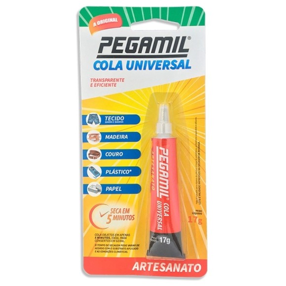 Pegamil Cola Universal Artesanato é um adesivo desenvolvido especialmente para uso em trabalhos manuais, hobbies, artesanatos e para reparos em casa, no escritório e na escola. Indicado para colagem de papel, cartão, passamanaria, telas, cartolina, madeira, couro, acrílico, PVC. Pegamil Cola Universal Artesanato é rápido e fácil de limpar. Não adere em polietileno, polipropileno e PTFE.