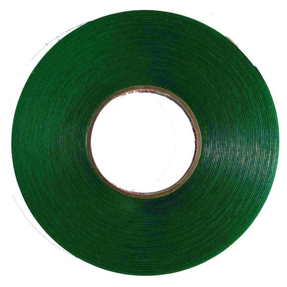 Fita Dupla Face de Massa Acrílica - transparente, com 1,0mm de espessura e liner verde.