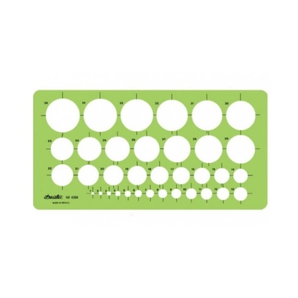 Circulógrafo em milímetros. Contendo 35 círculos, de 1 a 35 mm, com todos os raios para colocação fácil do centro. Gabarito para uso técnico, artístico ou profissional.